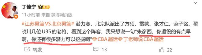 结果没曾想北京和江苏的比赛后,北京队潜力赛派出的阵容更加夸张,首发阵容除了翟晓川、方硕这两位快要退役的老将,还有范子铭、雷蒙、张才仁这几位中生代,5人加起来154岁。这也再度引起了球迷的讨论:“俱乐部故意恶心篮协的吧?”、“这叫潜力赛,北京这五个人哪个还有潜力?”、“平均年龄30.8岁,难道30岁是当打之年吗?”