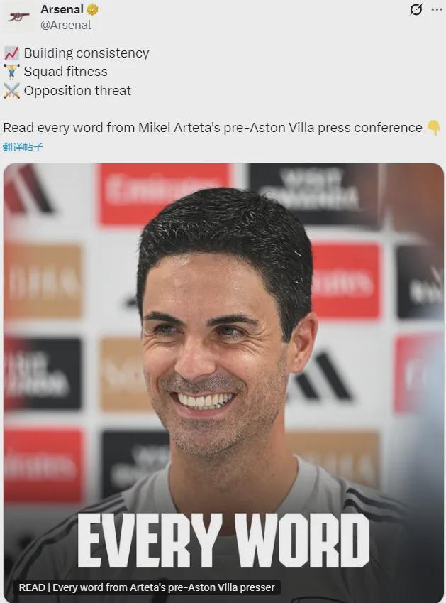 阿尔特塔出席了赛前新闻发布会,我们来看阿森纳主帅谈到了哪些重点问题。