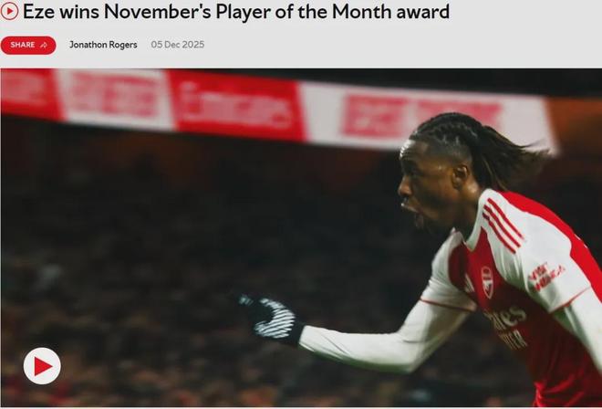官方:阿森纳宣布埃泽被票选为了队内11月最佳球员!